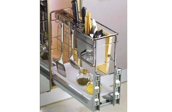 Một số thiết bị phụ kiện hiện đang được sử dụng phổ biến trong hầu hết các kết cấu tủ bếp phải kể tới đó chính là giá bát đĩa, kệ đựng gia vị, giá đựng xoong nồi, tủ kho… Bên cạnh đó, tủ bếp cũng cần được trang bị thêm các phụ kiện lắp đặt như ray trượt tủ, bản lề, tay nâng cánh tủ… để đảm bảo kết cấu tủ bếp vững chắc và bền bỉ.