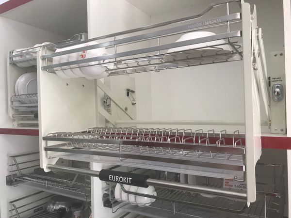 - Với cảm quan thẩm mỹ và công dụng tiên tiến, bất cứ kết cấu bếp nào cũng có thể dành một phân thiết kế dành cho giá nâng hạ bát đĩa. Nếu chiều cao của người trong gia đình là “như cái sào” thì không nói làm gì, nhưng nếu cả nhà toàn “nấm” thì quả thực là lợi thế, giá nâng hạ lúc đó sẽ thể hiện ra khả năng hoàn hảo phục vụ cả những vị khách khó chiều nhất.