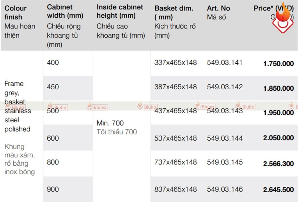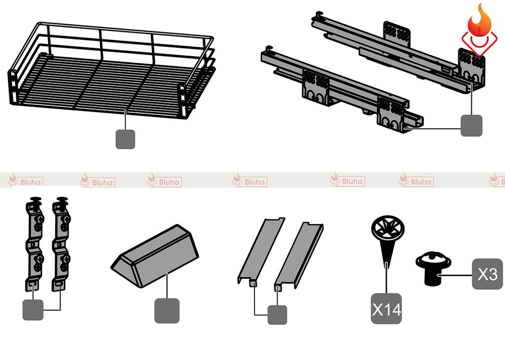 Trọn bộ sản phẩm gồm: 1 bộ rổ, 1 cặp ray, 1 cặp bas liên kết ray, 1 cặp nắp che ray, 1 bộ ốc vít lắp đặt.