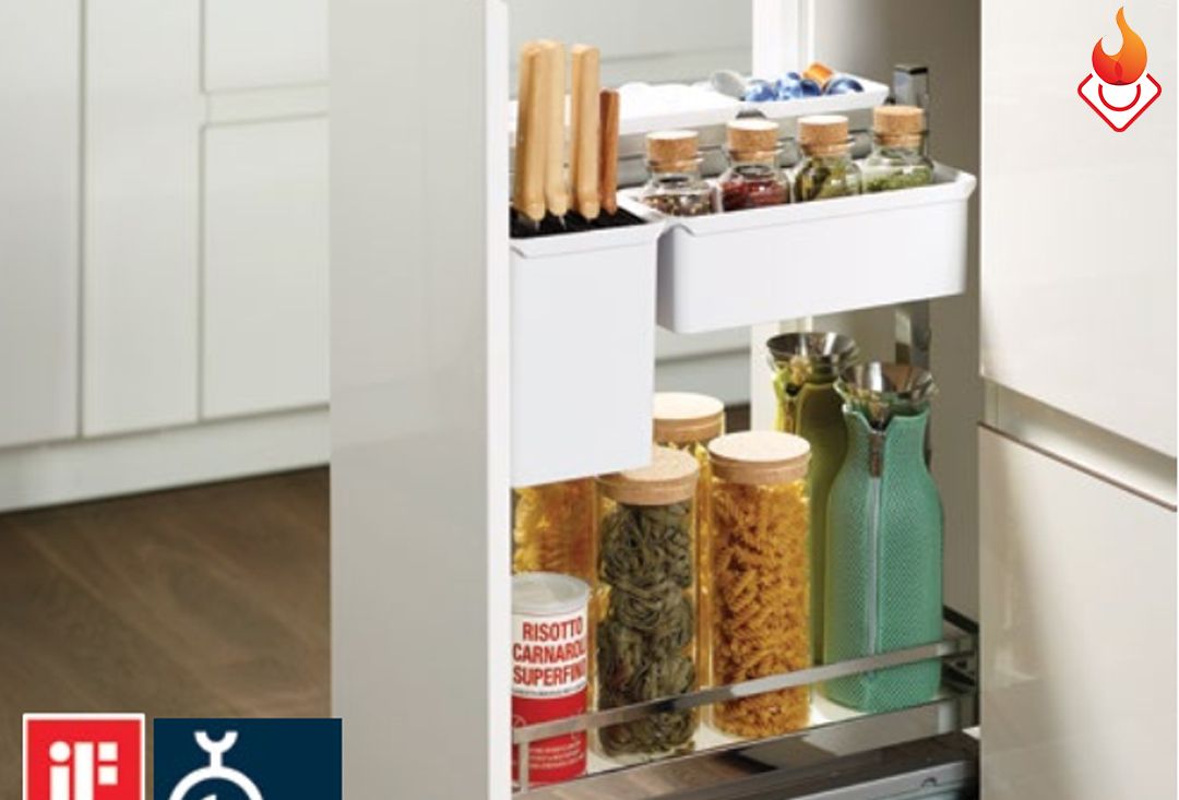 Bộ rổ kéo Dipensa Junior III Hafele màu trắng sáng được lắp dặt ở tủ bếp dưới, đựng được chai lọ, dao thớt, dễ dàng vệ sinh.