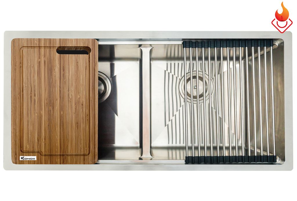 - Chậu thiết kế hạ bậc, tích hợp các phụ kiện thông minh trên bề mặt và lòng chậu, hỗ trợ việc nội trợ đắc lực hơn.