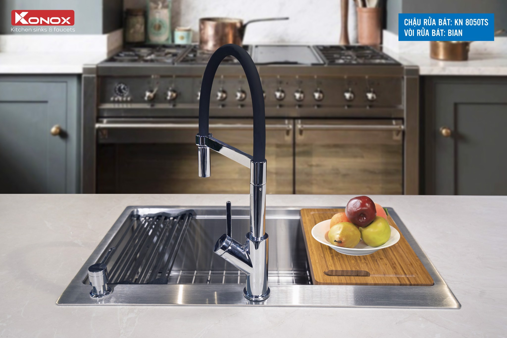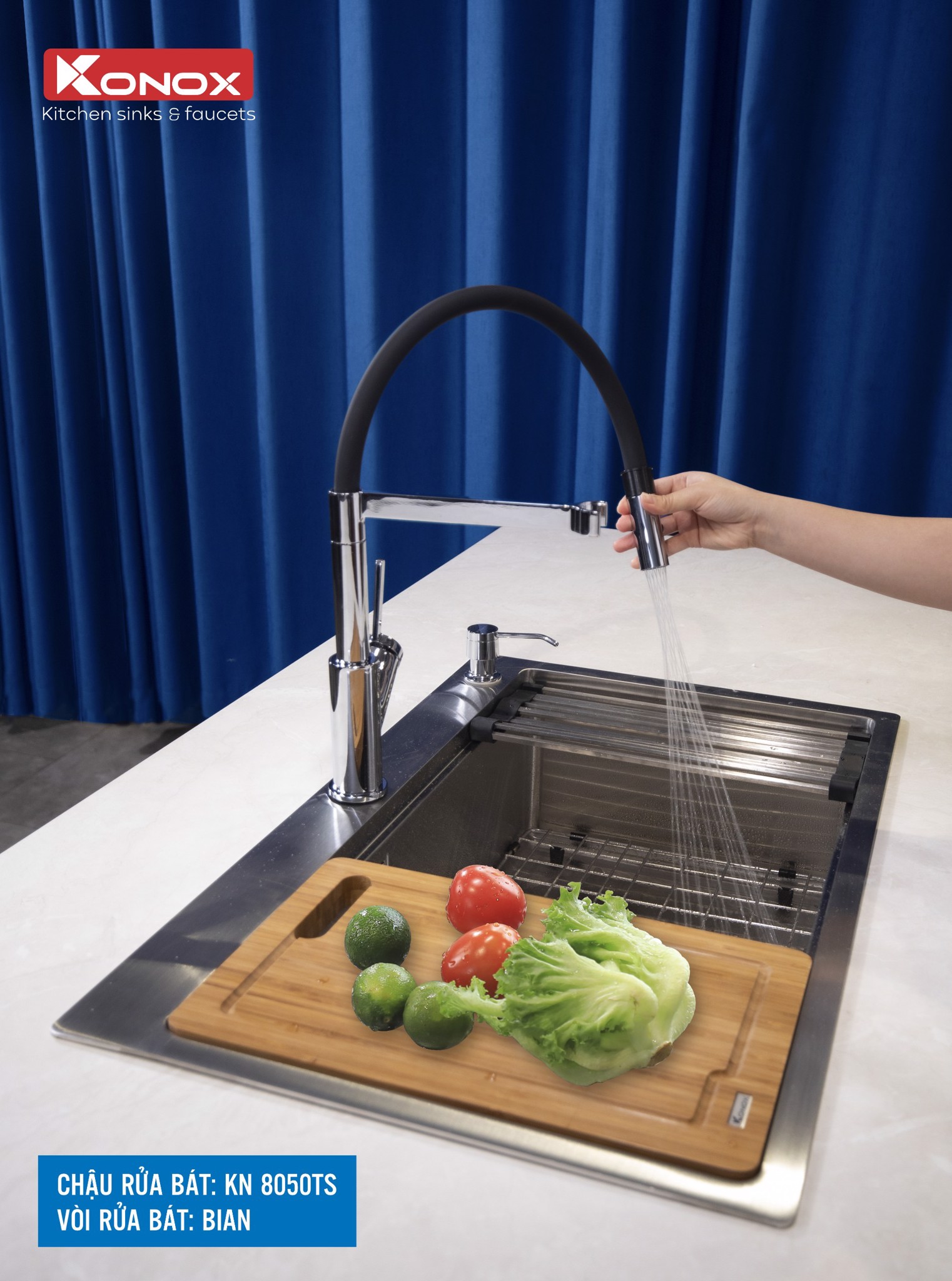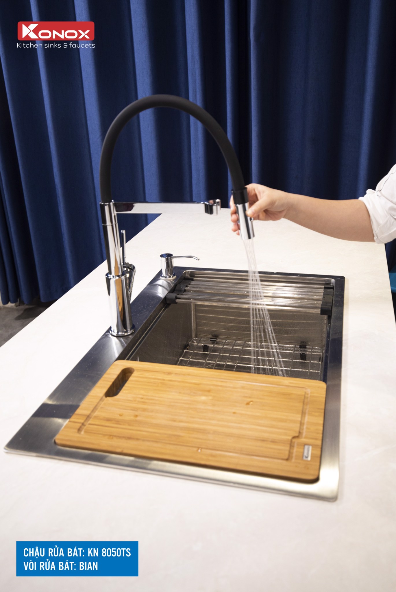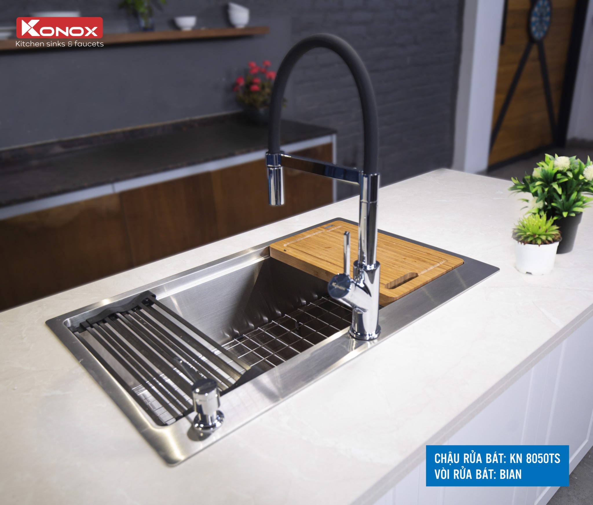 - Điểm khác biệt ấn tượng của Model KN8050TS là thiết kế hạ bậc giúp tích hợp thớt gỗ và các phụ kiện, cho phép người dùng thao tác thái cắt đồ nấu ngay trên mặt chậu, tạo nên trải nghiệm mới lạ và tiện ích độc đáo