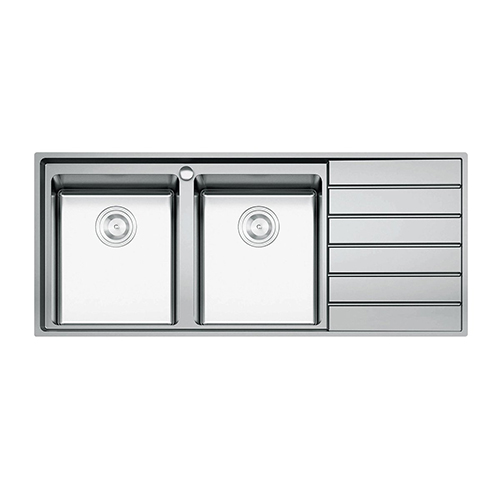 - Chậu thiết kế hạ bậc, tích hợp các phụ kiện thông minh trên bề mặt và lòng chậu, hỗ trợ việc nội trợ đắc lực hơn.