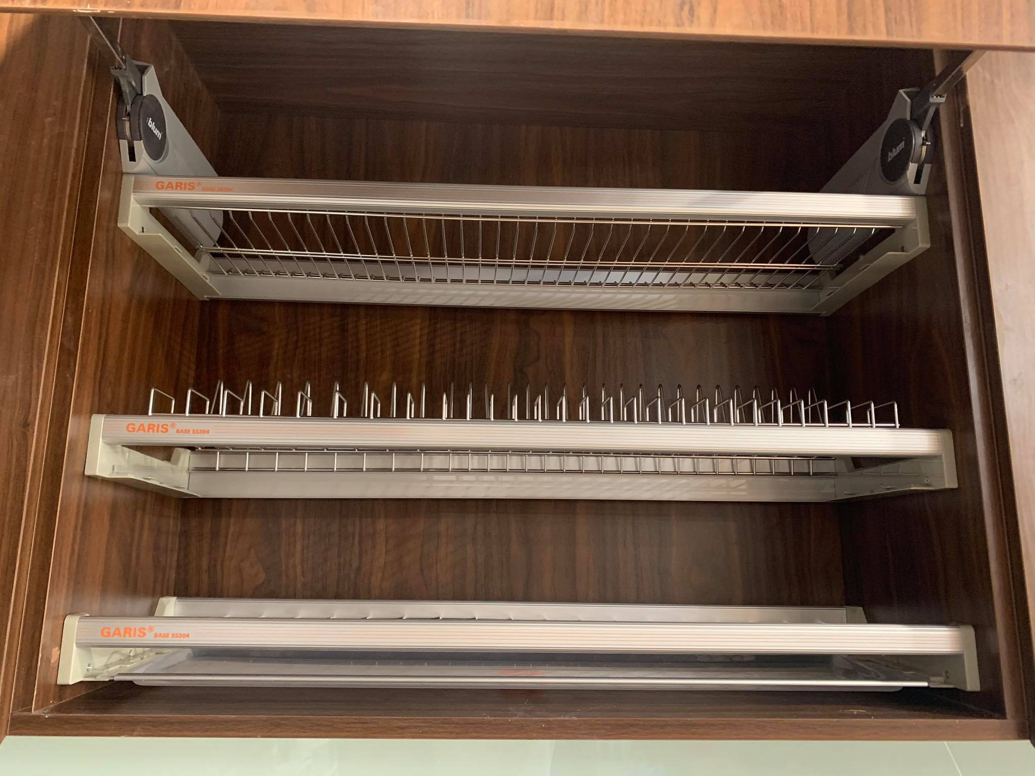 Tầng trên và dưới cùng được thiết kế dạng lượn sóng và khoảng cách giữa các nan rộng hơn, thuận tiện hơn trong việc úp bát, cốc chén.