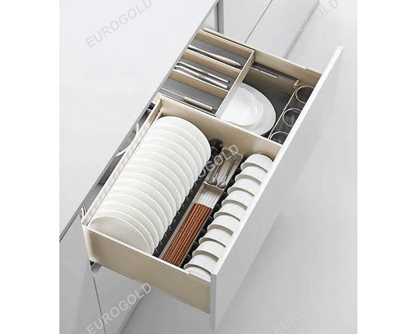 Khi cần lưu trữ xoong nồi, bát đĩa người dùng chỉ việc sắp xếp vào kệ. Ngoài ra, Giá bát đĩa Eurogold EUM60 hộp nhôm Anode còn được thiết kế với 2 ray trượt tích hợp giảm chấn ở 2 bên hộc tủ, hỗ trợ chuyển động ra vào của giá êm hơn, không gây ra bất cứ tiếng ồn nào khi đóng mở. Hệ thống chuyển động hỗ trợ giá có thể trượt 100% ra phía ngoài, bạn có thể quan sát toàn bộ các vật dụng trong giá và sắp xếp chúng một cách dễ dàng.