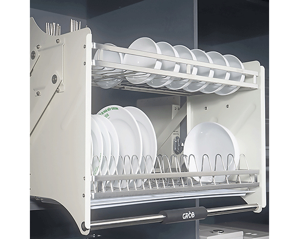 - Bên cạnh đó, nhờ sự hỗ trợ của 2 nút trợ lực 2 bên giá bát giúp giảm tối đa trọng lượng của kệ giá khi nâng lên. Do vậy, việc sử dụng sản phẩm này giúp cho quá trình sử dụng bát đĩa trở nên tiện lợi và tiết kiệm được thời gian rất nhiều.