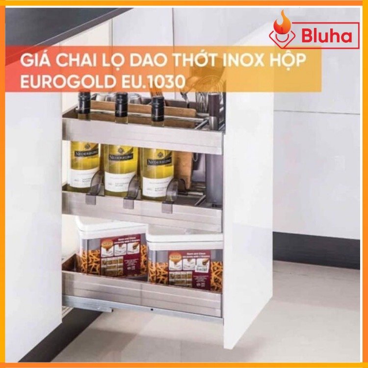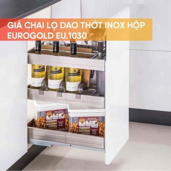 Giá chai lọ, dao thớt Euro Inox hộp - cánh kéo - ray trượt giảm chấn là một phụ kiện bếp không thể thiếu trong một căn bếp hiện đại, giúp chị em nội trợ có thể tiết kiệm thời gian nấu nướng, có những giây phút bên gia đình nhiều hơn.