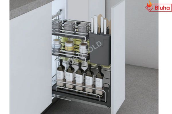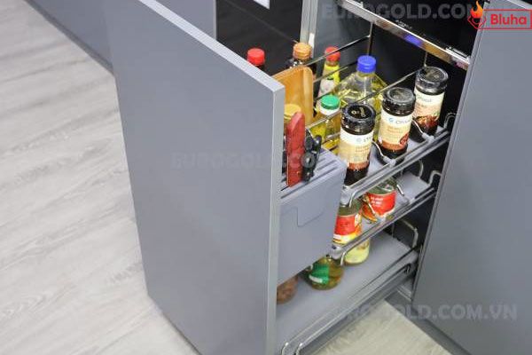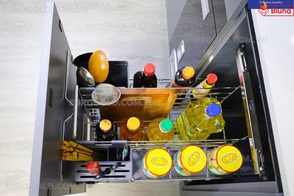 Giá dao thớt – gia vị nan oval có hệ thống ray giảm chấn chuyển động nhẹ nhàng, êm ái, giảm tiếng ồn trong không gian bếp một cách hiệu quả. Bộ ray có cấu tạo chắc chắn, chịu được trọng tải lớn lên tới 20kg giúp bạn thoải mái lưu trữ, bảo quản các chai lọ gia vị, dao thớt và đũa thìa tránh môi trường ẩm mốc và sinh vật gây hại.