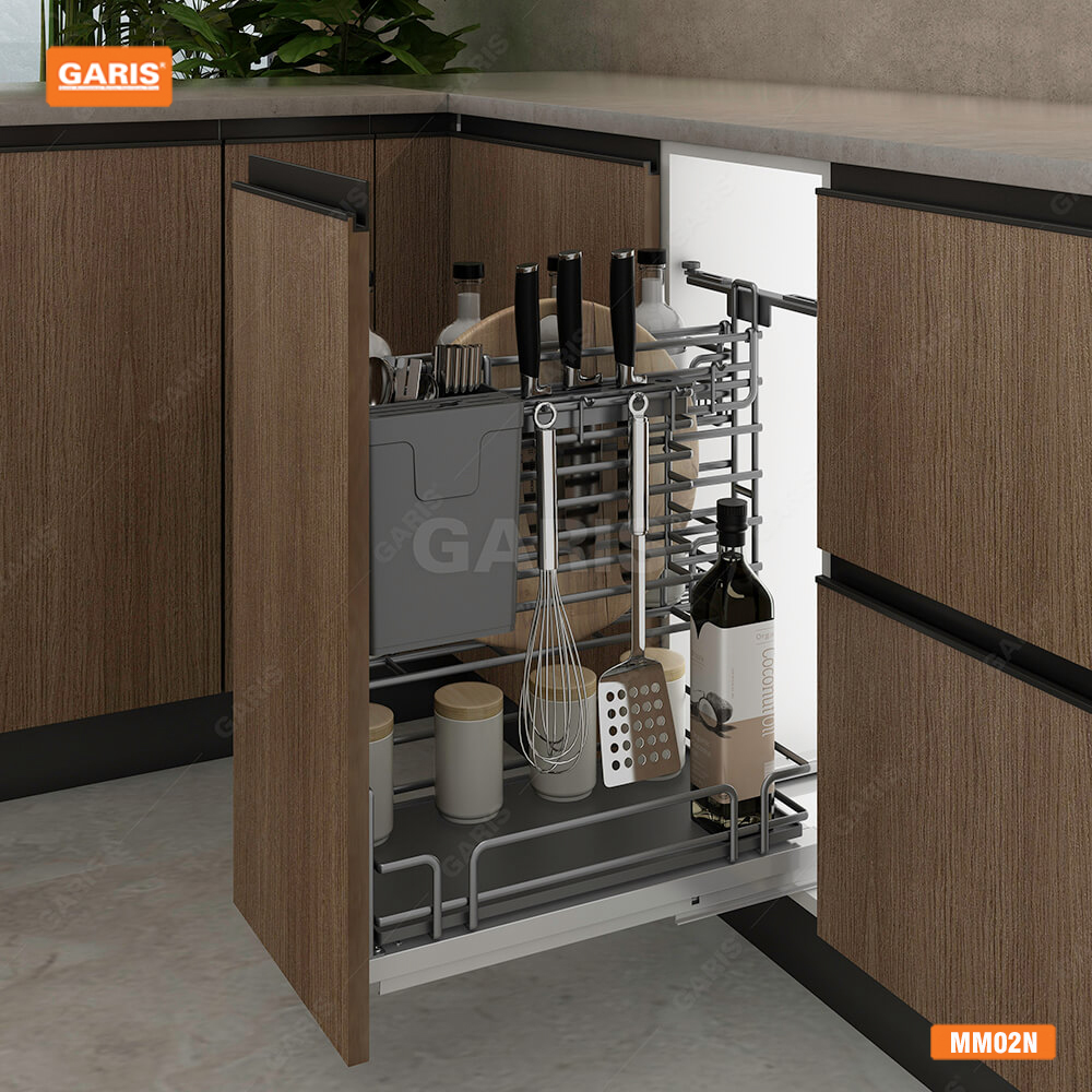 Giá dao thớt, gia vị, chai lọ Garis MM02N là sản phẩm hữu ích mang đến sự sắp xếp hợp lý cho các chai lọ, hộp đảm bảo sự gọn gàng, ngăn nắp và hơn thế nữa là tính hiện đại trong lối thiết kế. Chai, lọ, hộp một số gia vị, đồ dùng khô là một trong những thực phẩm dễ vỡ và chiếm không ít diện tích trong không gian bếp.
