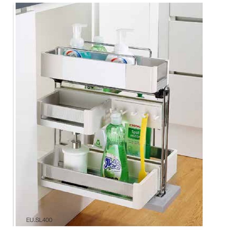 Giá đựng chai lọ tẩy rửa Eurogold EU.SL400 sử dụng để các chất tẩy rửa, xà phòng, nước rửa chén,...Những loại chất tẩy rửa thường không có lợi cho sức khỏe con người, vì thế việc sắp xếp chúng ở một giá riêng biệt là điều rất cần thiết. Thêm vào đó có thể tránh nhầm lẫn giữa các loại chai lọ khác nhau mà lại đảm bảo sức khỏe cho các thành viên trong gia đình.