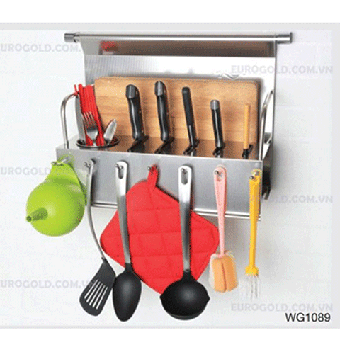 • WG1089 sẽ giúp bạn sắp xếp gọn gàng rất nhiều vật dụng: thớt, dao, đũa thìa ở khoang riêng biệt. Ngoài ra thiết kế 1 hàng móc để treo các loại muôi và một số vật dụng khác.
