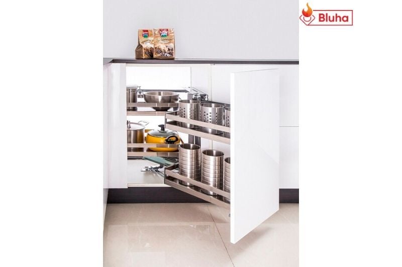 Có 4 sàn đựng dạng hộp nằm trong 1 góc tủ bếp giúp bạn vừa đựng được nhiều đồ vừa tiết kiệm không gian.
