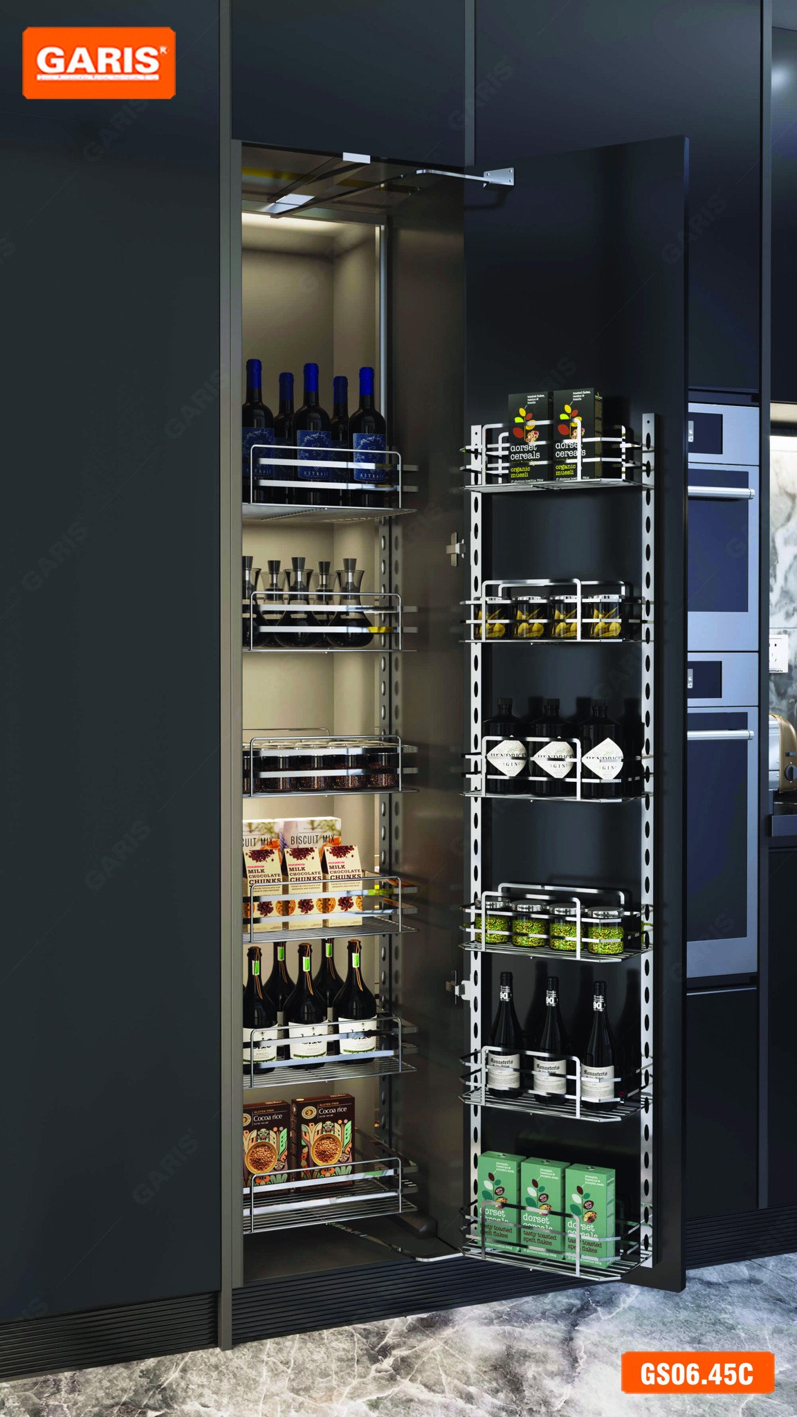 Hệ giá kho Garis GS06.45C được thiết kế hiện đại mang lại sự thẩm mĩ cao cho không gian bếp.