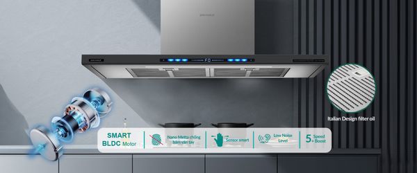 - Sensor Touch Smart: Điều khiển cảm ứng màu với 5 tốc độ hút và chế độ Booster giúp loại bỏ mùi hôi, dầu mỡ nhanh chóng.