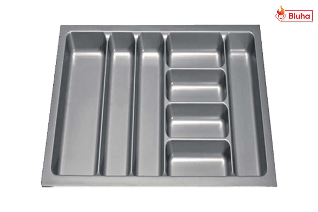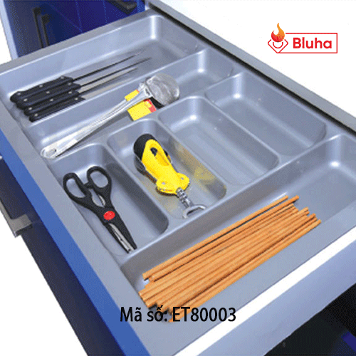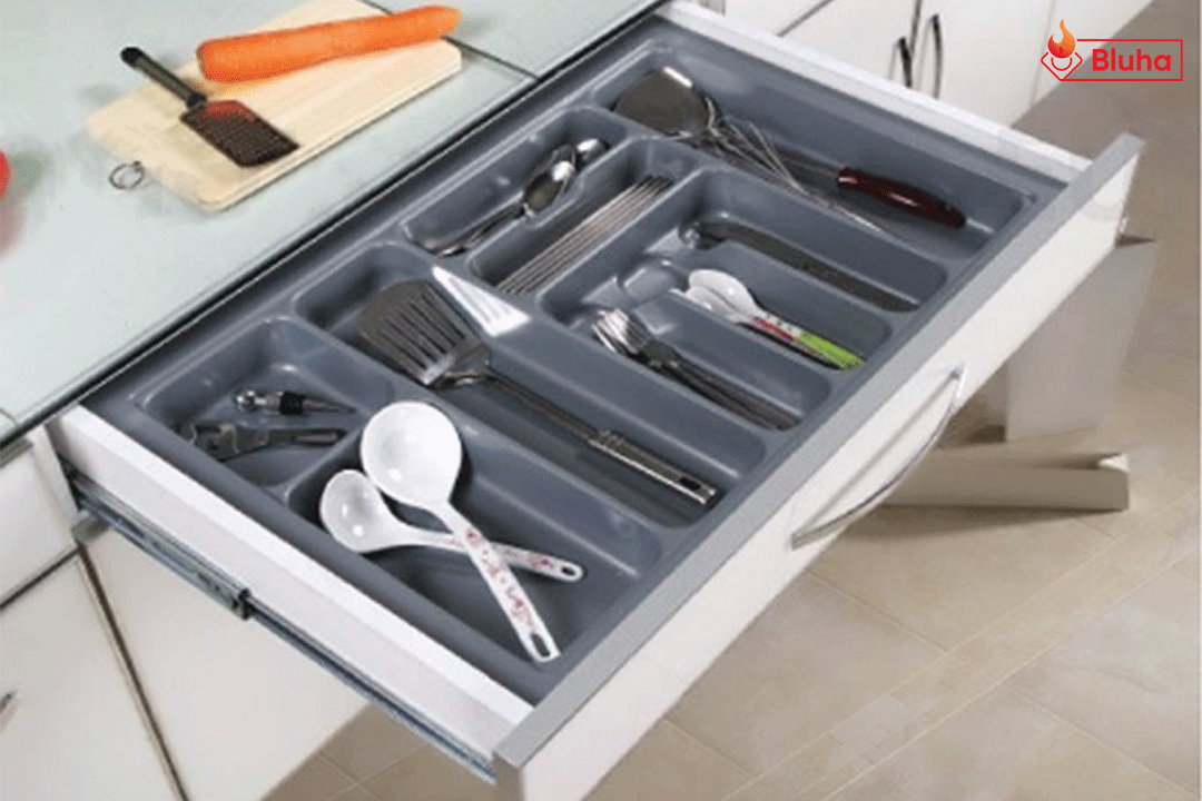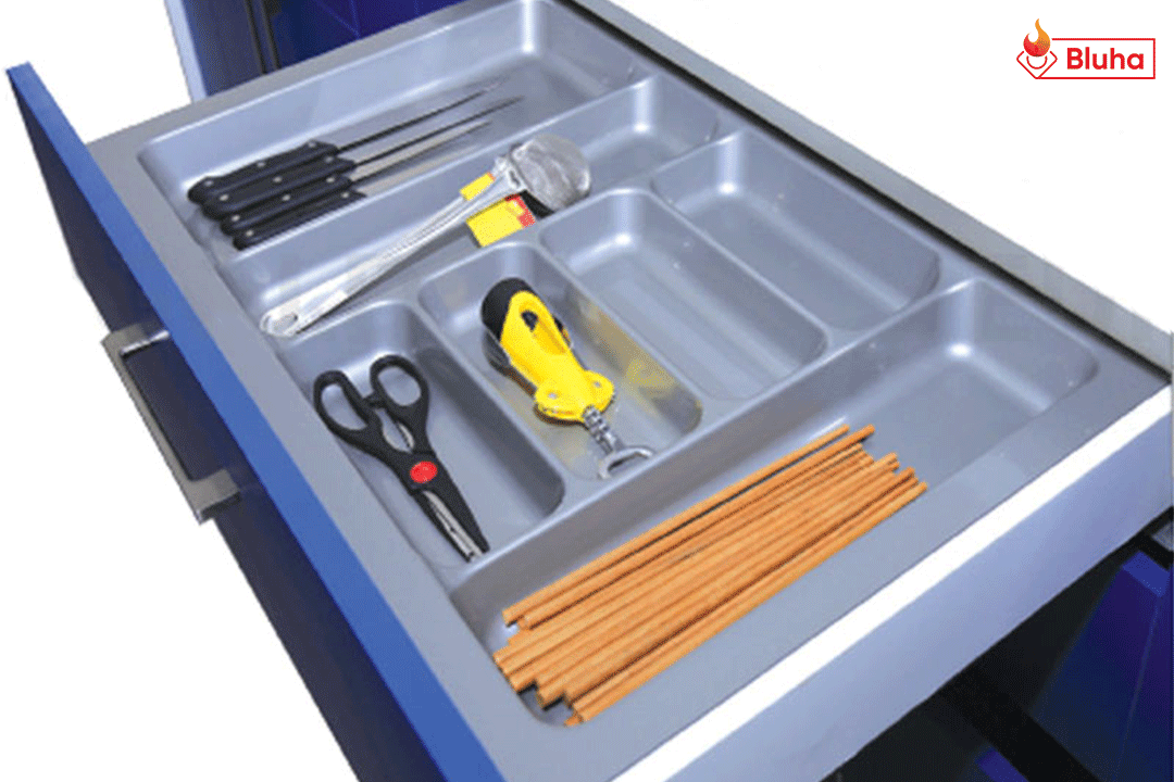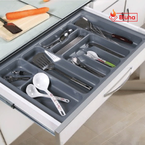 Với dao, thìa, dĩa... ăn hằng ngày chúng ta thường cất giữ chúng ở các giá đựng dành riêng cho các vật đúng đó. Còn đối với những vật dụng ít khi được sử dụng thì sẽ được cất trong các ngăn kéo, nhưng chúng ta không thể để chúng lẫn lộn vào nhau trong cùng một ngăn kéo được, mà sử dụng mỗi sản phẩm vào một ngăn kéo thì rất lãng phí, giải pháp đặt ra ở đây chính là sử dụng phụ kiện tủ bếp khay chia ngăn kéo.