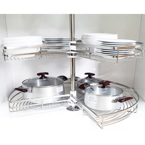 Với thiết kế một trục cố định ở giữa và 2 mâm inox xoay 270 độ giúp việc cất giữ đồ như cốc chén, bát đĩa, chai lọ… trở nên đơn giản hơn. Vừa gọn gàng và ngăn nắp lại vừa tiết kiệm tối đa được không gian bếp.