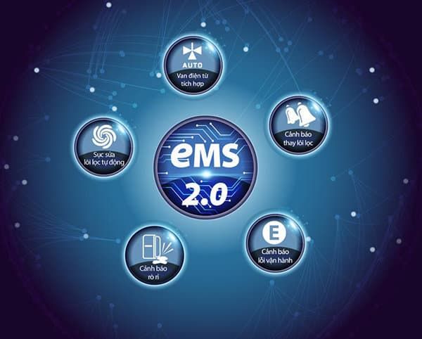 Hệ thống giám sát điện tử EMS 2.0 giúp theo dõi và cảnh báo tình trạng vận hành của máy lọc nước nhằm đảm bảo gia đình bạn có một nguồn nước sạch nhất. Hệ thống bao gồm các chức năng: cảnh báo thay thế lõi lọc, cảnh báo rò rỉ, sục rửa lõi lọc tự động, van điện từ tích hợp, cảnh báo lỗi vận hành. Bên cạnh đó vòi nước được thiết kế theo phong cách tối giản mang tới sự tiện nghi cho người dùng.