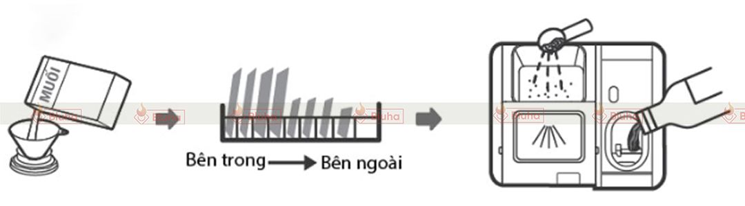 Những tạp chất có trong nước nếu không được lọc sạch sẽ gây ảnh hưởng tới chất lượng và độ bền của máy rửa bát. Do vậy, thiết kế bên trong không thể thiếu hộp chứa muối. Vị trí của hộp này nằm sát ở phía trong máy, ngay dưới khay rửa bát dưới. Trong quá trình hoạt động, muối trong hộp chứa muối sẽ tự động điều chỉnh lấy một lượng phù hợp, nhằm loại bỏ hoàn toàn tạp chất có trong nước, đảm bảo nguồn nước rửa sạch sẽ nhất. Tuy nhiên, người dùng cần lưu ý sử dụng muối dùng riêng cho máy rửa bát, không dùng các loại máy thông thường để tránh ảnh hưởng tới máy.