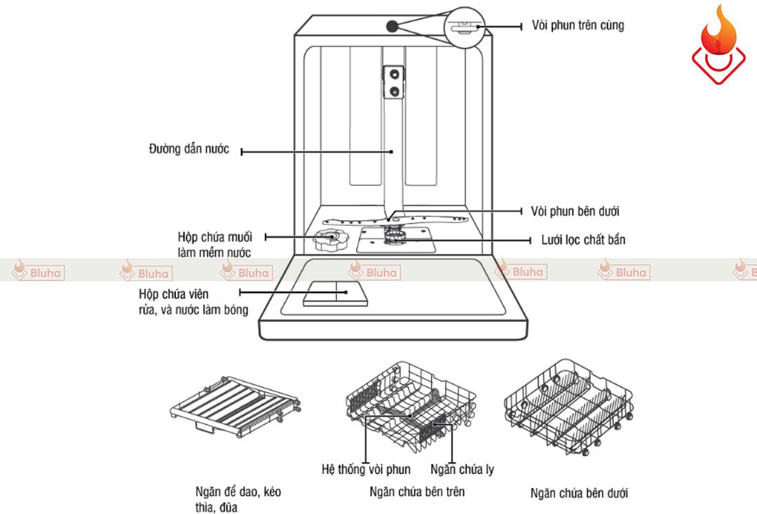 Nên sắp xếp khay dưới rồi tới khay trên. Các loại xoong, nồi chảo lớn đặt ở khay dưới, các loại bát đĩa nhỏ ở khay trên. Khi đặt bát đĩa vào khay rửa, nên úp mặt bát đĩa xuống, đáy hướng lên trên, để bát đĩa không bị đọng nước trong quá trình rửa.