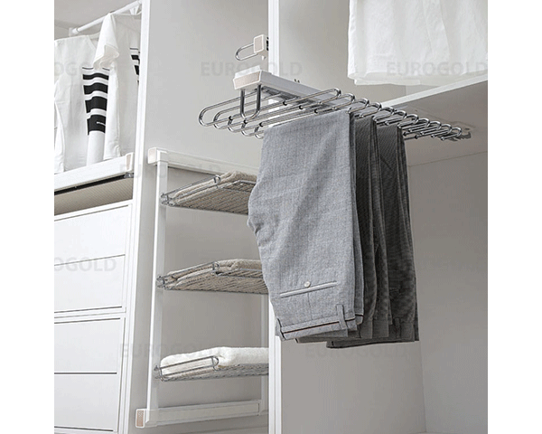 Móc treo quần âu Eurogold EUA7110 là phụ kiện hữu ích nằm trong tủ quần áo giúp cho việc sắp xếp quần áo được ngăn nắp, nhất là những bộ quần áo đi làm đã được là ủi phẵng phiu. Ưu điểm về giá trị sử dụng lớn nhất của bộ phụ kiện này là giúp cho việc quần áo không thể nhăn và dễ dàng thao tác lấy ra mà không ảnh hưởng đến các bộ quần áo khác khi xếp chúng chồng lên nhau như chúng ta vẫn thường thấy
