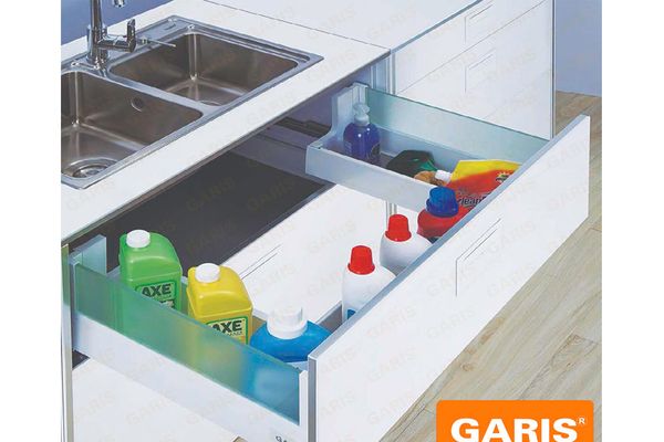 Thông thường người ta thường thiết kế khoảng không gian dưới chậu rửa trống vì dưới chậu rửa là nơi có môi trường ẩm thấp khó để đồ, hơn nữa là vướng các đường ống dẫn nước. Xung quanh chậu rửa thường có rất nhiều các chai rửa bát, rửa tay, rửa hoa quả gây cảm giác thiếu ngăn nắp cho cả khu bếp. Để sắp xếp chúng lại ngăn nắp bạn nên sử dụng ngăn kéo chữ U dưới chậu rửa.