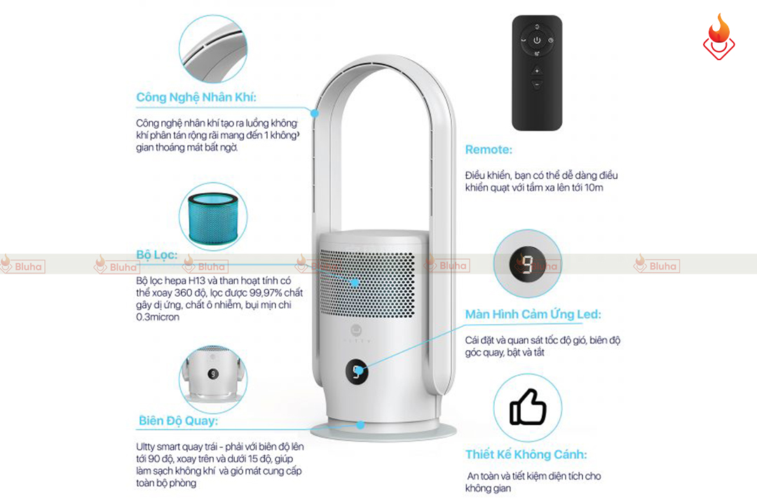 - Sở hữu 3 công nghệ hiện đại bậc nhất hiện nay: tăng áp tua bin, bội khí, tản nhiệt 4D, kết hợp cùng động cơ DC không chổi than mạnh mẽ, Ultty Smart tạo ra tốc độ gió lên tới 4,5 m/s (tương đương 16,2 km/h) – tốc độ gió cao nhất trong các dòng quạt không cánh hiện nay.