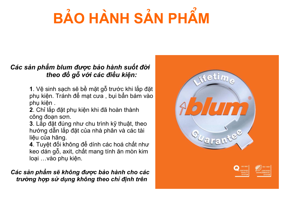 Lưu ý : Lắp đặt đúng theo yêu cầu kỹ thuật của sản phẩm để đảm bảo được sự hoạt động theo tiêu chuẩn của nhà sản xuất cũng như hoàn hảo theo thiết kế của phụ kiện blum.