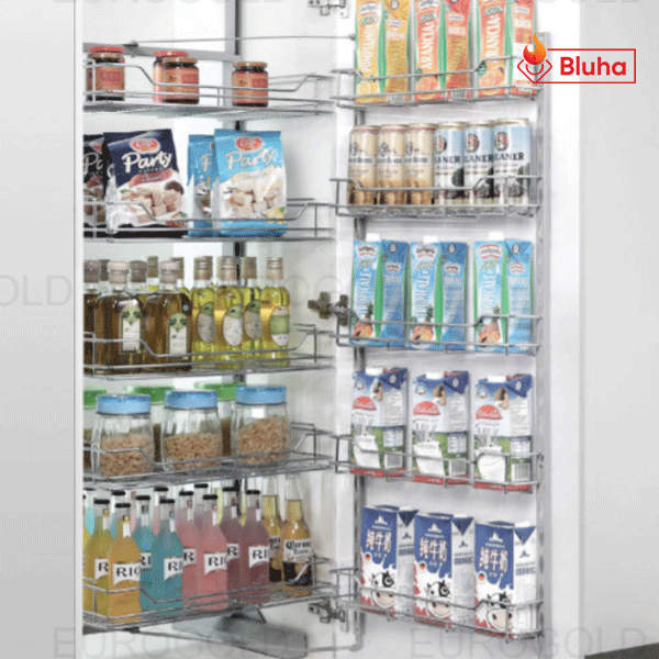 Thay vì xếp đồ đạc một cách không khoa học tạo nên sự bề bộn cho bếp thì tủ kho sẽ đem tới cho bạn sức chứa vô cùng lớn giúp căn bếp luôn sạch sẽ, gọn gàng. Với thiết kế 4 tầng, 8 rổ đựng. bạn có thể tha hồ cất gọn tất cả các vật dùng, đồ ăn.. vào khoang tủ phía sau cánh cửa tủ.