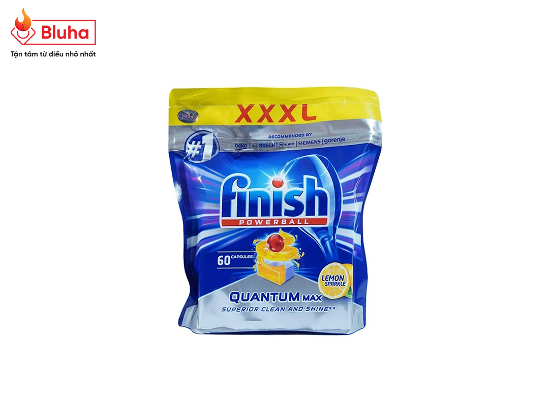 Túi 60 viên rửa chén Finish Quantum Max Dishwasher Tablets Lemon (là viên rửa chén cao cấp chuyên dùng cho máy rửa chén).